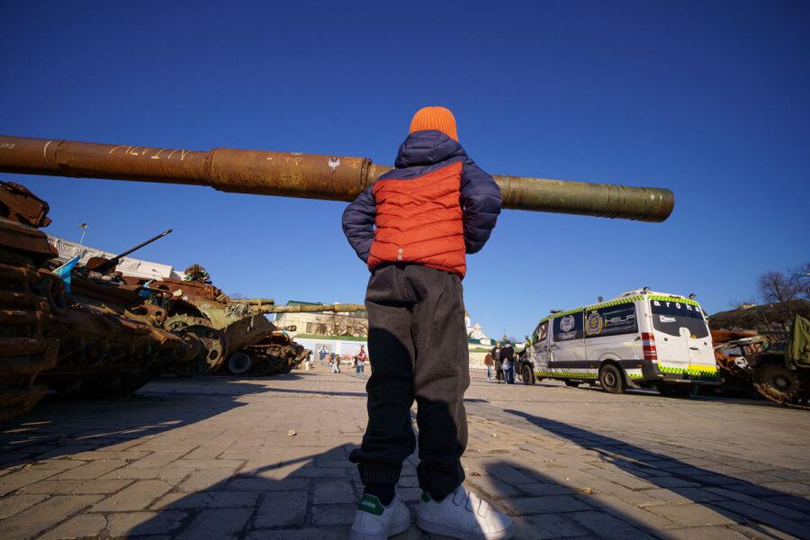 If you walk further from Maidan to Mykhailivska Square, destroyed Russian military equipment still stands there — meant to advance on Kyiv, but ultimately unable to capture it. The war, however, has not disappeared: the city continues to live under the threat of air attacks. People come here in silence, rarely agreeing to speak, leaving flowers and short messages — a sign of memory, pain, and anger.